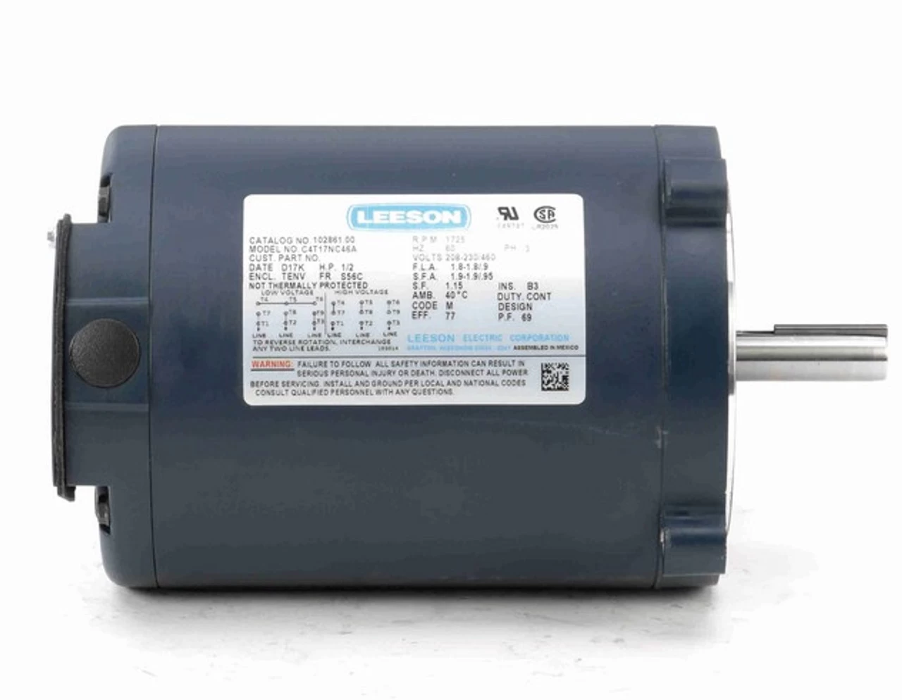 General purpose motor can be used for many applications requiring a three phase Electric motor with a C-face mount. Motor has rigid base with C-Face mount. Shaft has keyway. Motor has 4 threaded bolt holes on face for mounting a pump or gear head to the motor. Bolt holes are 3 3/4″ on center measured across the shaft. Wiring diagram on motor name plate. TENV = Totally Enclosed Non-Ventilated.102861.00