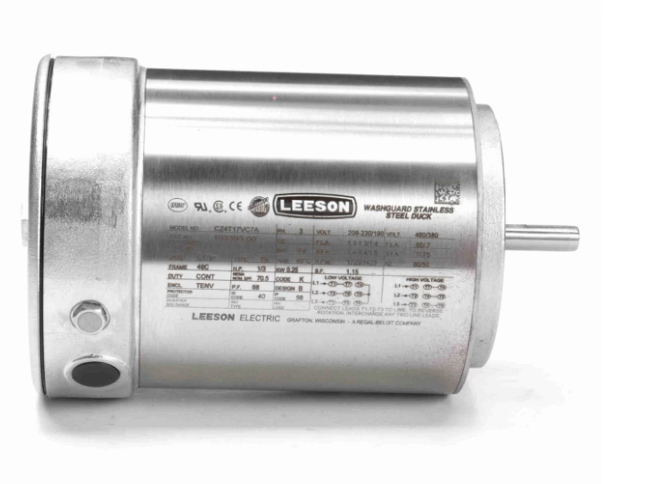 Stainless Steel wash-down motors are use in applications involving challenging caustic environments. This is a three phase electric motor with a C-face mount. Shaft has keyway. Motor has 4 threaded bolt holes on face for mounting a pump or gear head to the motor. Bolt holes are 5 7/8″ on center measured across the shaft. Wiring diagram on motor name plate. TENV = Totally Enclosed Non-Ventilated. 103393.00