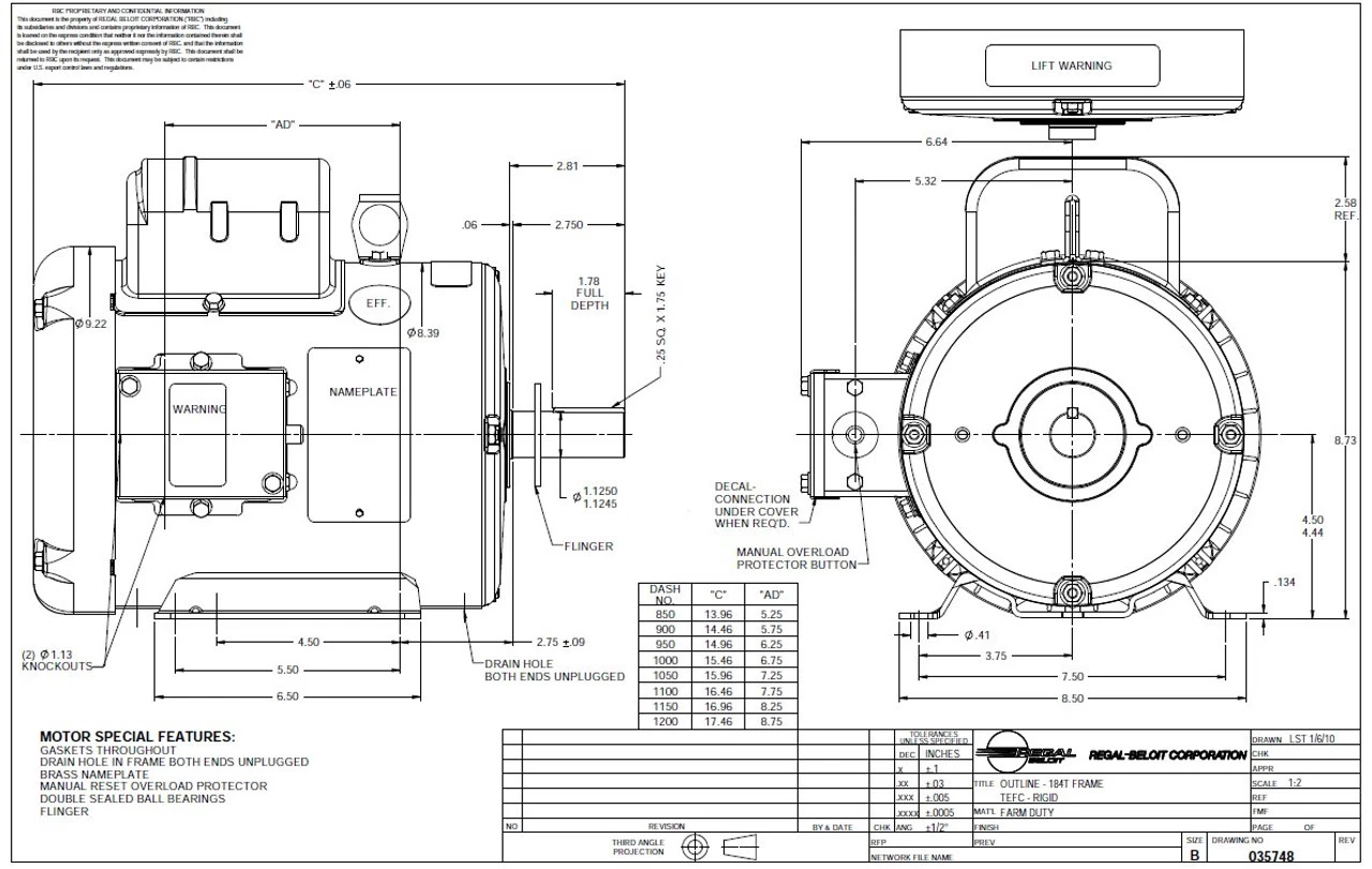 - NEMA 184T Frame – Flat Rigid base mount – 1 1/8″ Diameter shaft x 2 3/4″