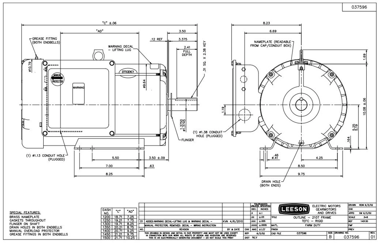 Single Phase Leeson Farm Duty High Starting Torque, Capacitor Start/Capacitor Run motor. Excellent motor for any application requiring a 10 hp motor. This Totally Enclosed motor is Excellent for woodworking machines and other industrial machines where the motor is exposed to saw dust, dirt, oil and other particles in the air that will damage the motor. Motor also has manual overload protection to prevent damage in an overload situation.