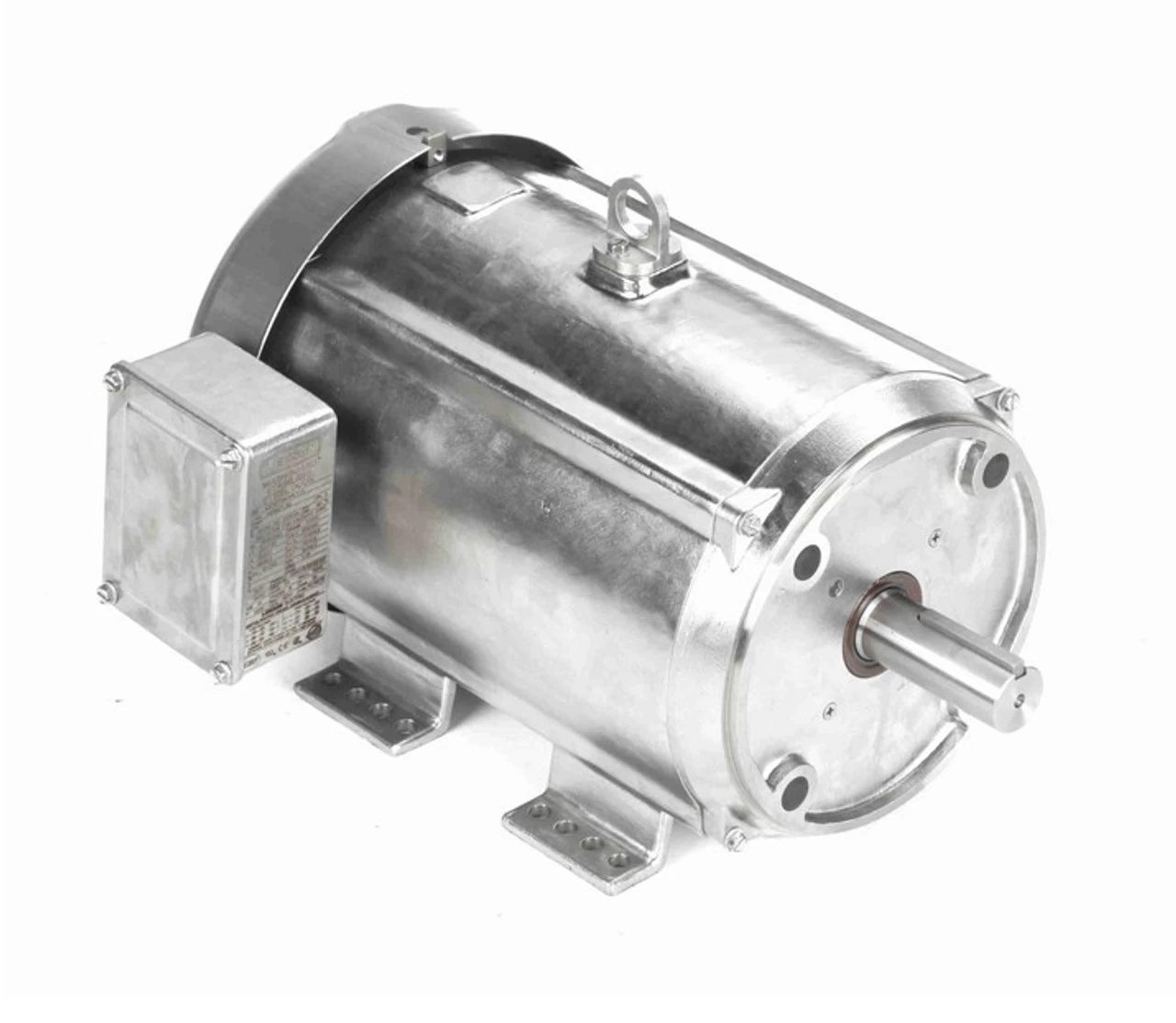 Premium Stainless Steel Wash Duty motor with a C-face mount for use in wet environments requiring the addition of strong corrosive disinfectants . Bolt holes are 3 3/4″ on center measured across the shaft. Wiring diagram on motor name plate. TEFC = Totally Enclosed Fan-Cooled. 140827.00