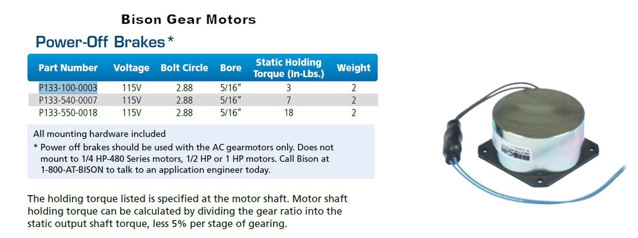 - 18 ft. pound Power off Brake for Bison AC Gear Motors 115V