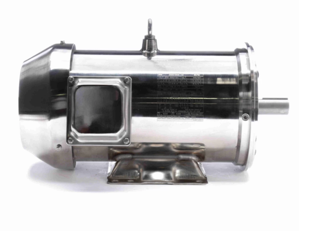 Full stainless steel exterior promotes resistance to water and chemical corrosion. This is a three phase electric motor with a C-face mount. Shaft has keyway. Motor has 4 threaded bolt holes on face for mounting a pump or gear head to the motor. Bolt holes are 5 7/8″ on center measured across the shaft. Wiring diagram on motor name plate. TEFC = Totally Enclosed Fan-Cooled. 194011.00