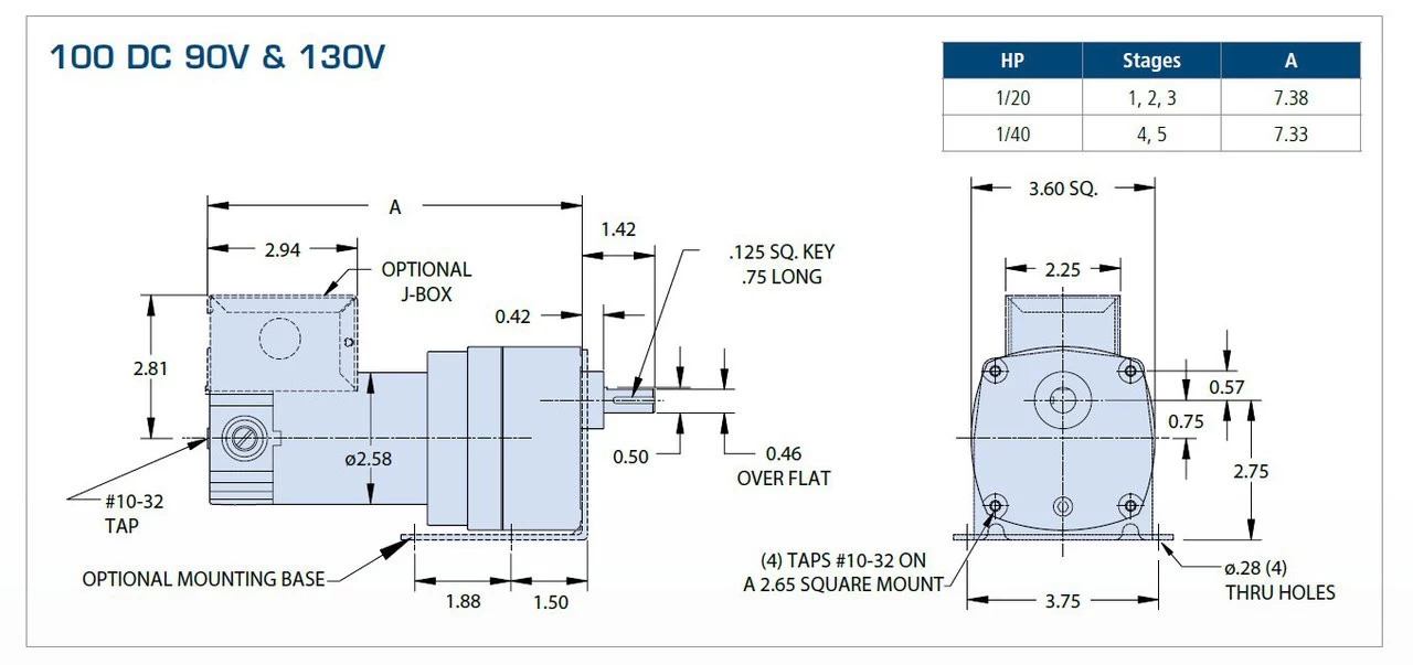 - 1/40 hp 1.3 RPM, .13 amps, 90 Volts DC