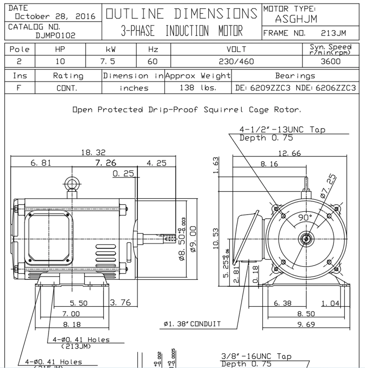 - 10 hp 3600 RPM, 24.3/12.2 amps 230/460 Volts 60hz. Three Phase
