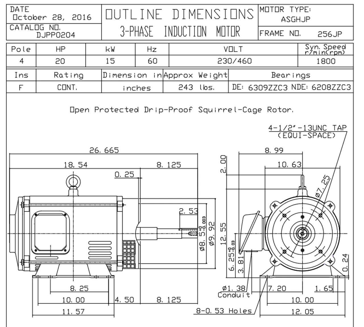 - 20 hp 1800 RPM, 48.5/24.3 amps 230/460 Volts 60hz. Three Phase