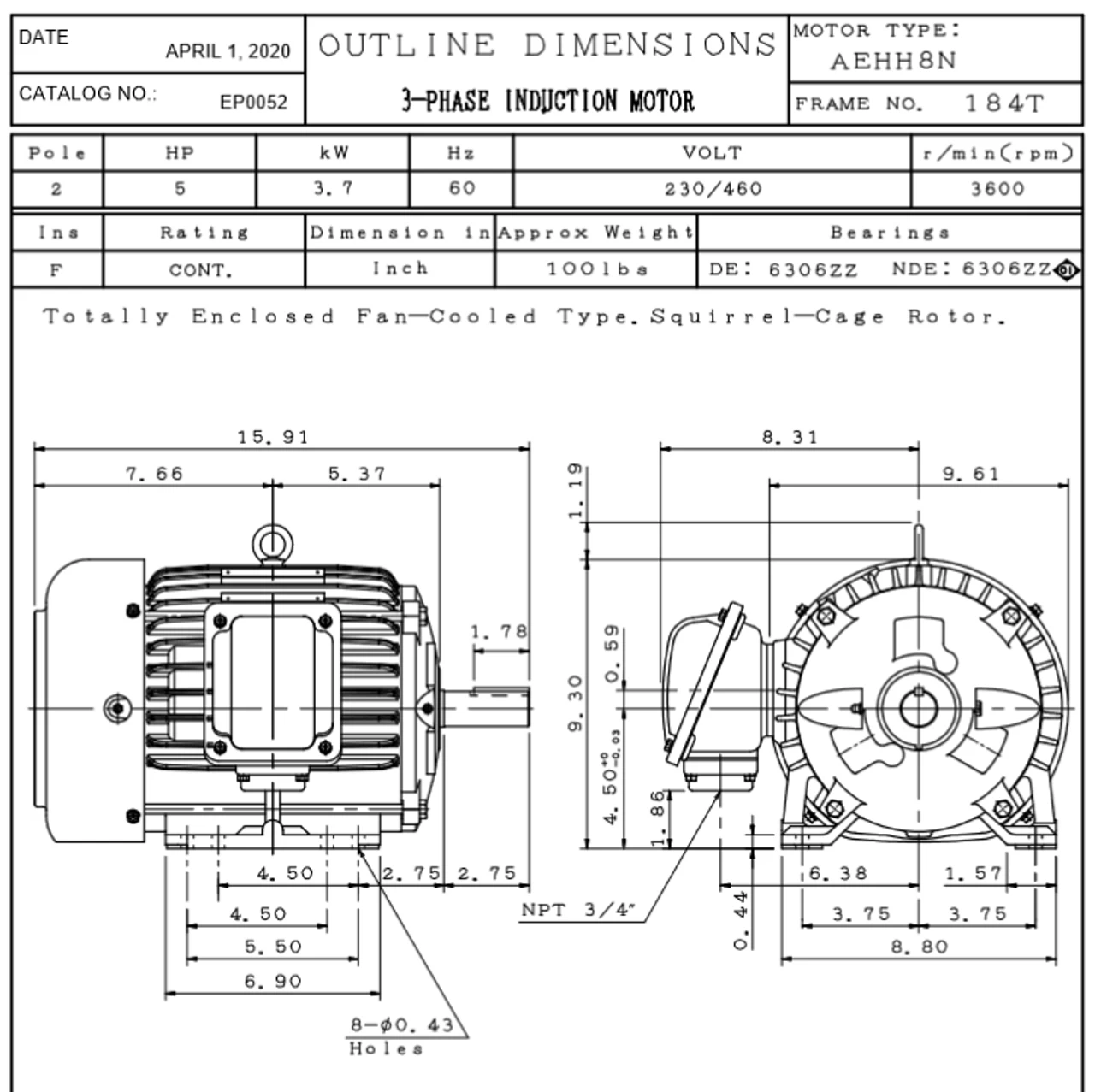 - 5 hp 3600 RPM, 11.4/5.72 amps 230/460 Volts 60Hz. Three Phase