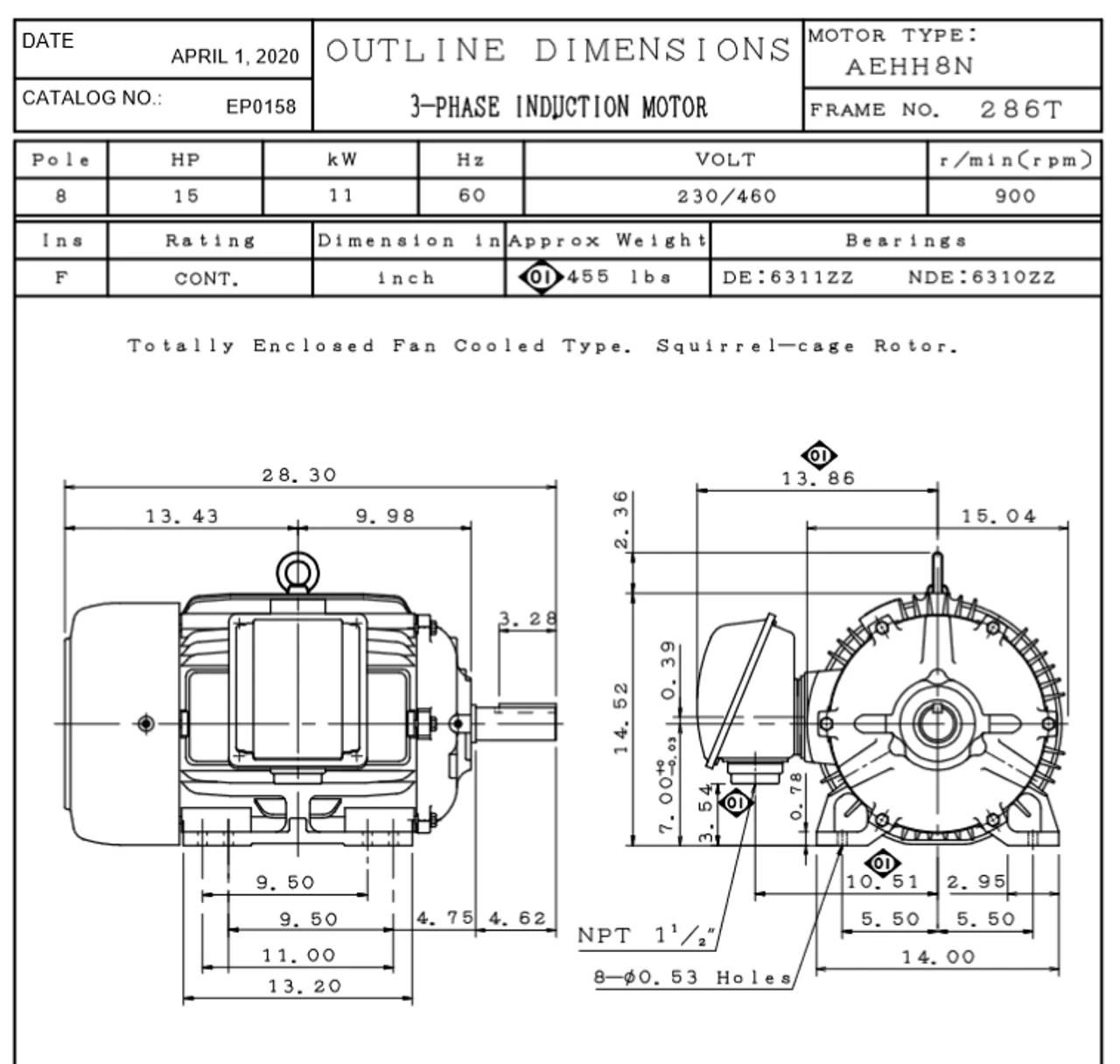 - 15 hp 900 RPM, 40.0/20.0 amps 230/460 Volts 60Hz. Three Phase