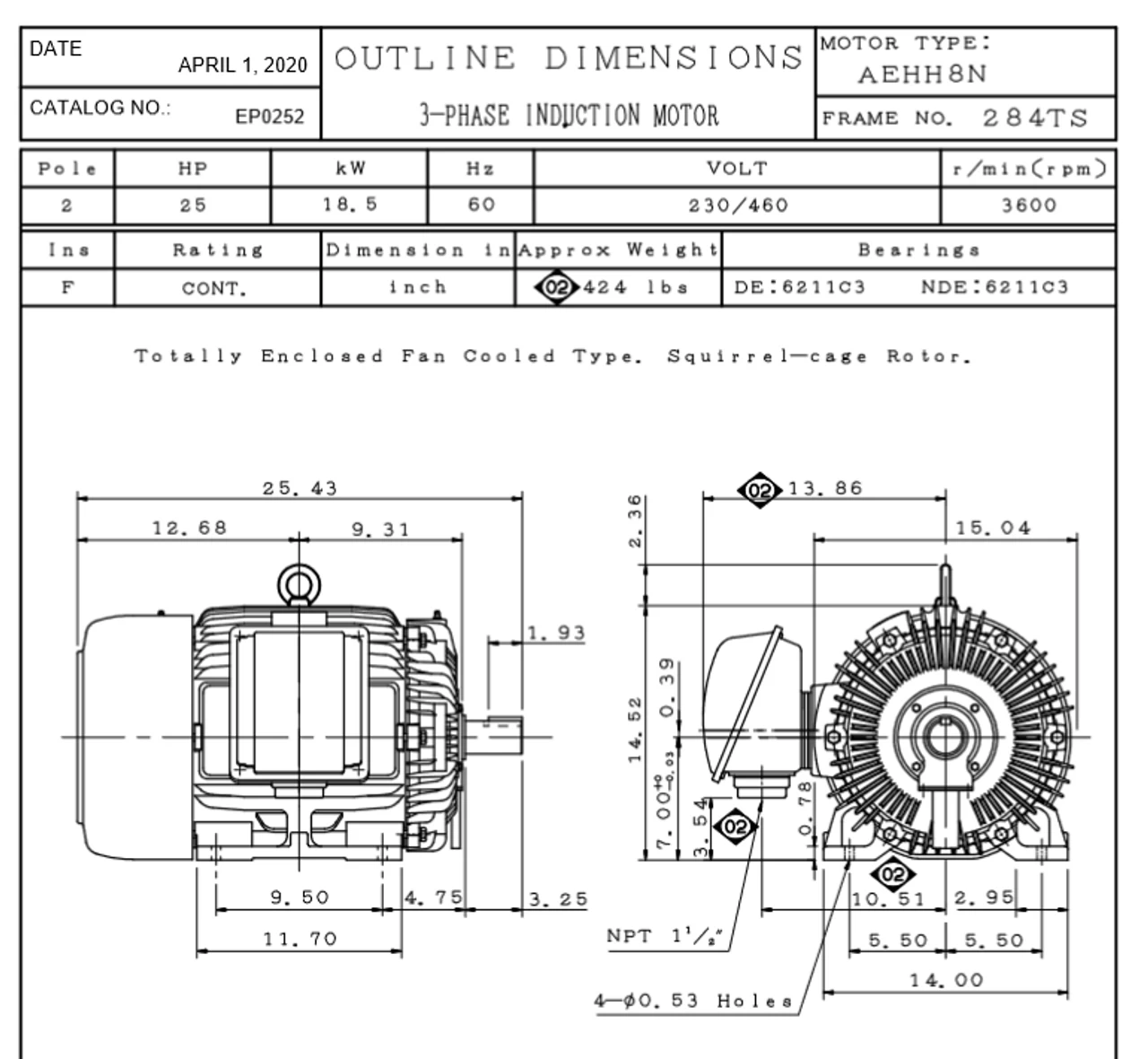 - 25 hp 3600 RPM, 55.6/27.8 amps 230/460 Volts 60Hz. Three Phase