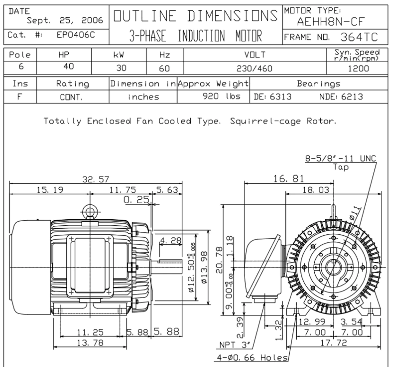 - NEMA 364TC Frame, 5 7/8 x 2 3/8″ Dia. Keyed Shaft