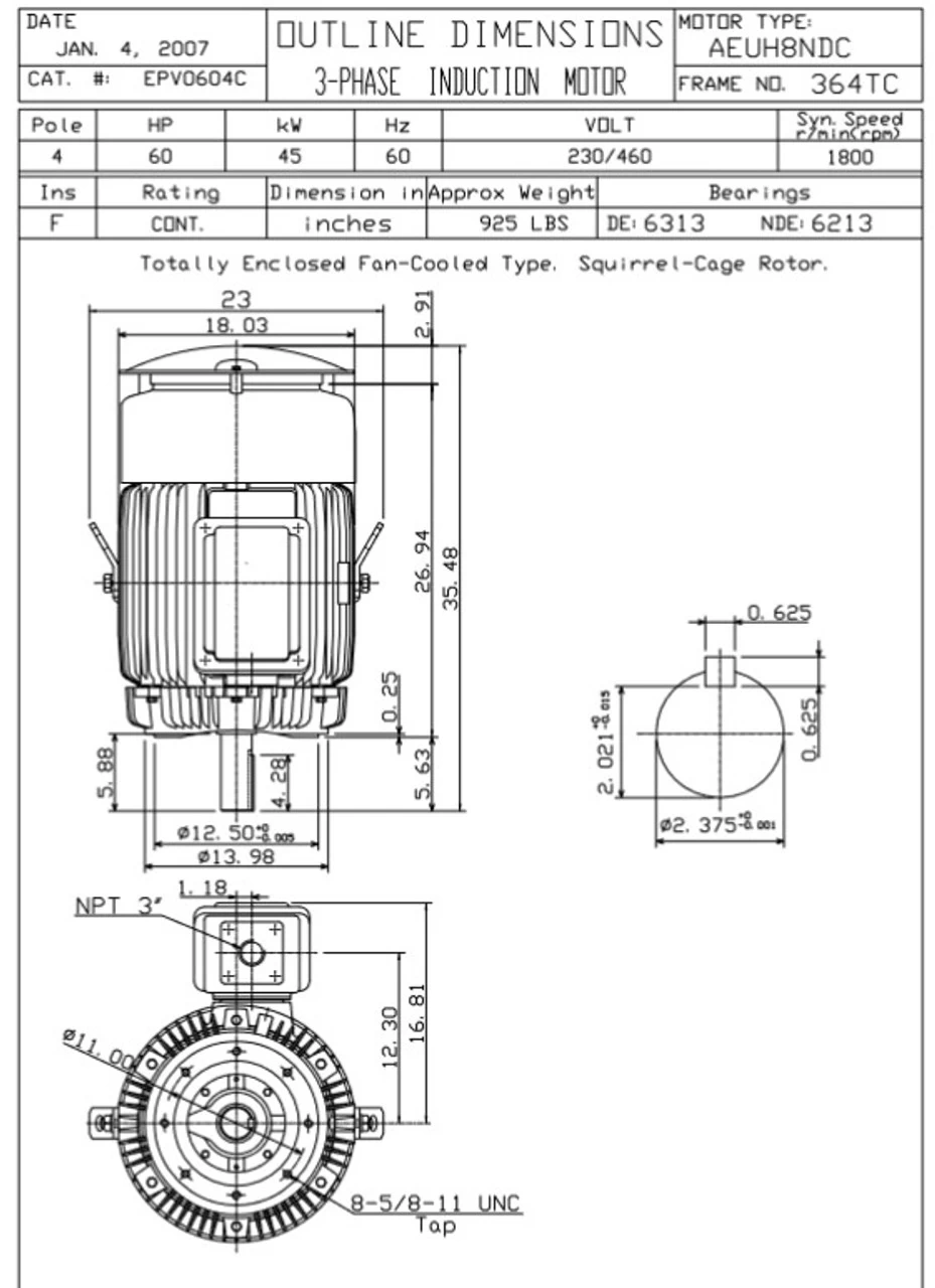 - NEMA 364TC Frame, 5 5/8 x 2 3/8″ Dia. Keyed Shaft