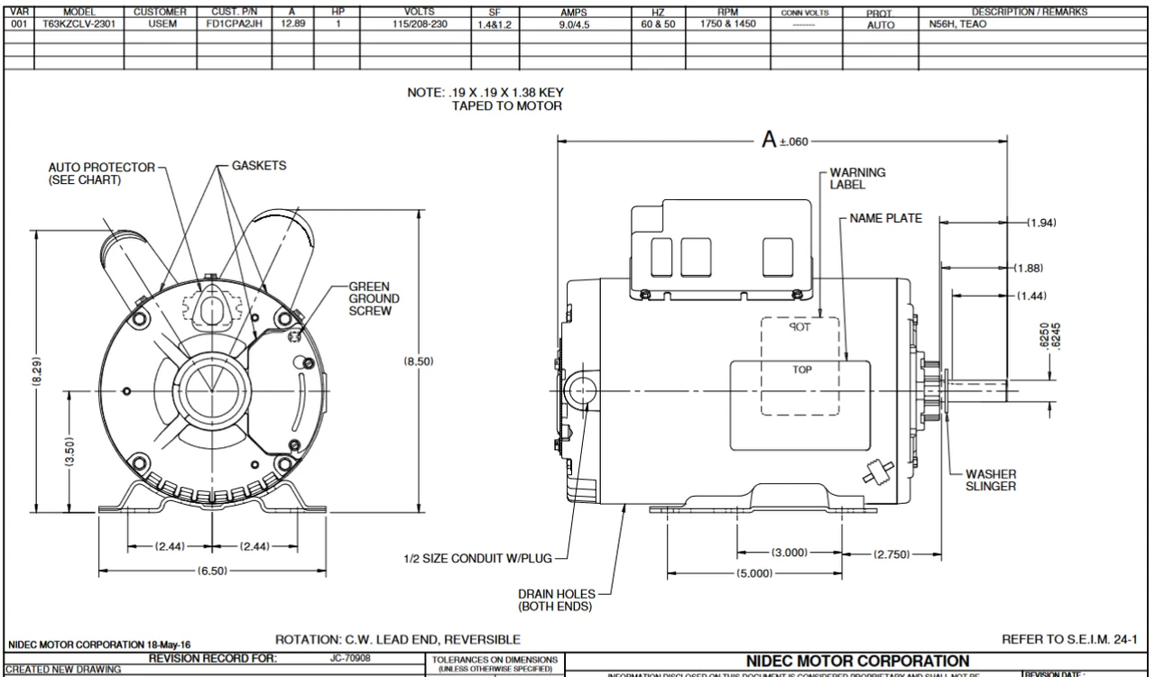 Single phase farm fan motor for poultry and livestock houses. Wiring diagram on motor name plate. TEAO = Totally-Enclosed Air-Over, T063CLV2301014B