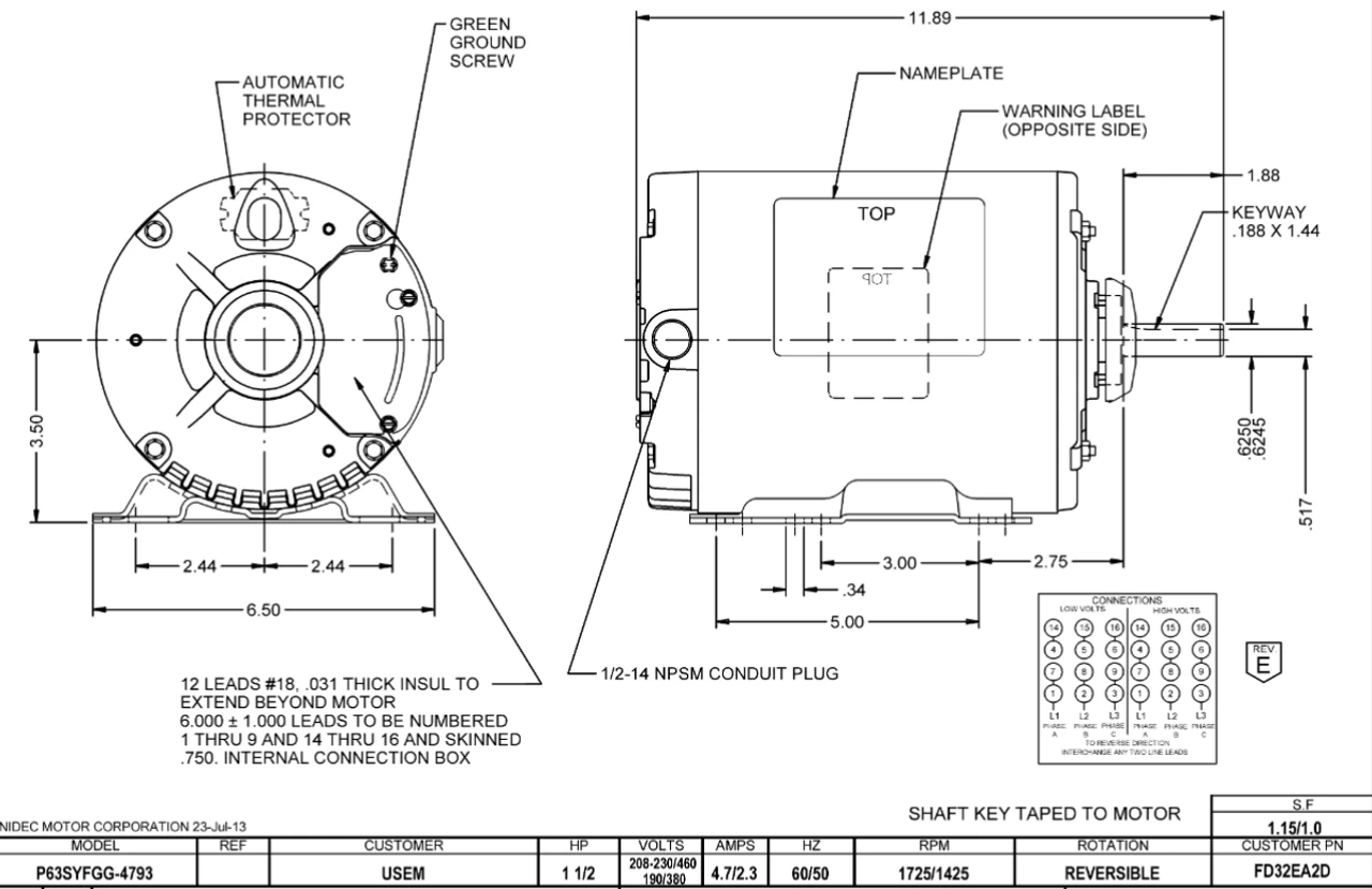 - 1 1/2 HP 1800 RPM (1 speed), 4.7/2.3 amps 208-230/460V Volts 50/60 Hz 3-Phase Motor