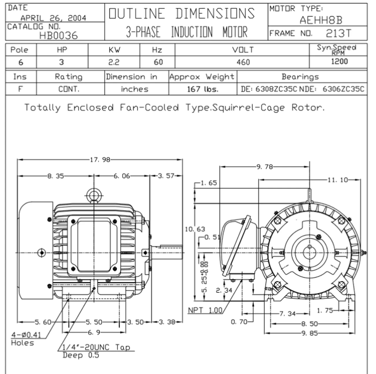 - NEMA 213T Frame, 3 3/8 x 1 3/8″ Dia. Keyed Shaft