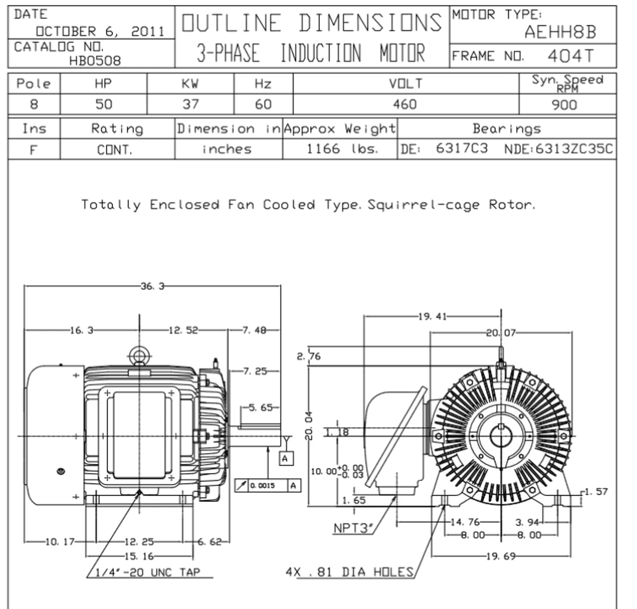 - 50 hp 900 RPM, 62.1 amps 460 Volts 60 Hz Three Phase