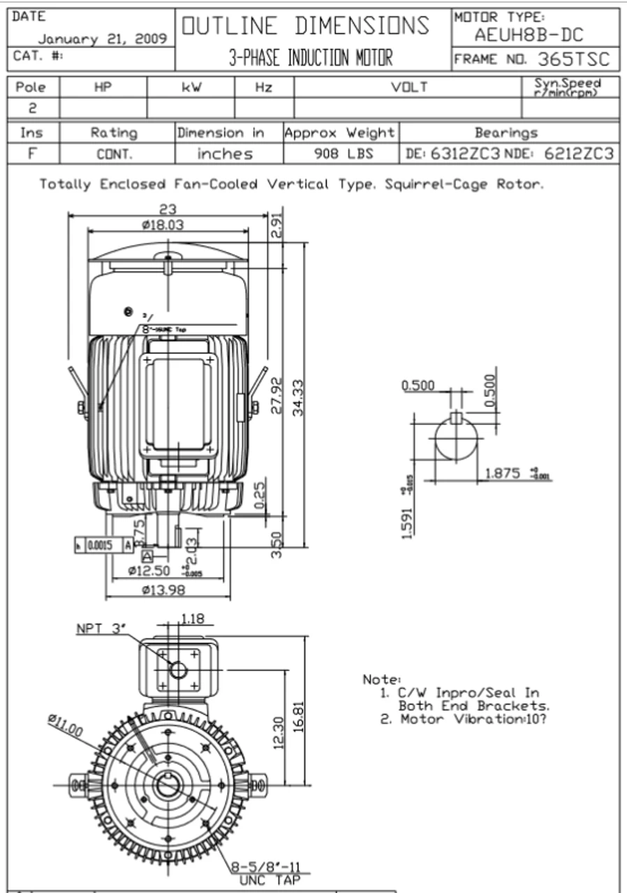 - NEMA 365TSC Frame, 3 1/2 x 1 7/8″ Dia. Keyed Shaft