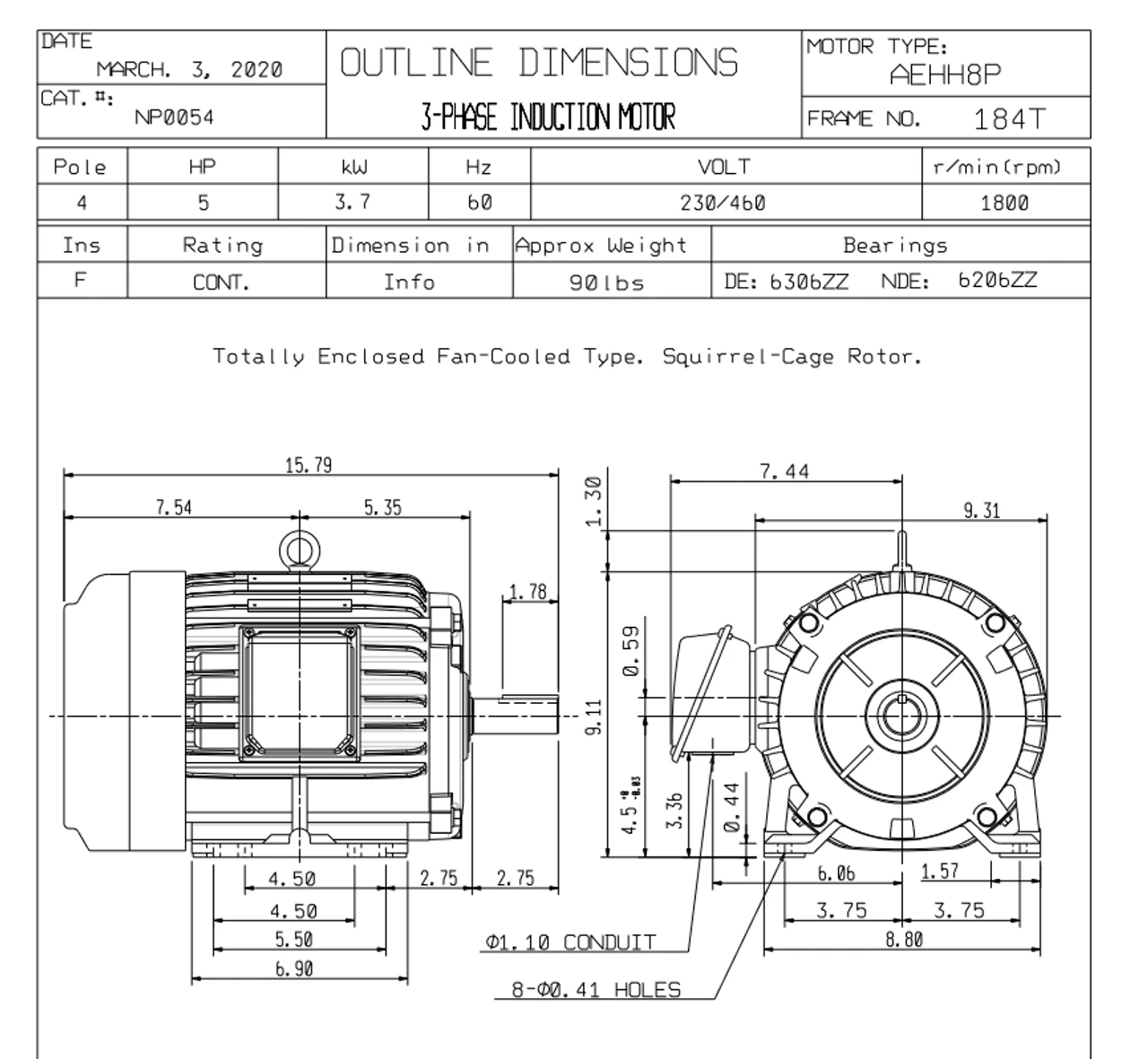 - Cast Iron Construction, Enclosure: Totally Enclosed Fan Cooled (IP54)