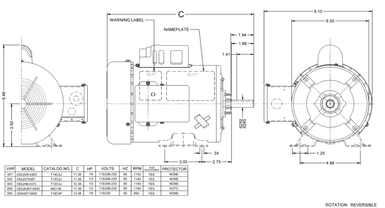 - Rigid Mount, Ball Bearings, Class B Insulation, Reversible