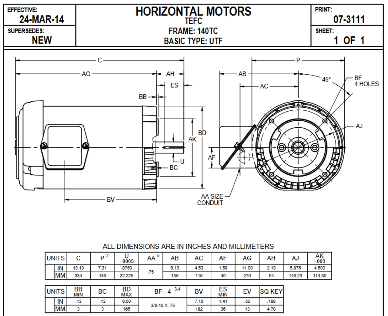 - NEMA 143TC frame Keyed Shaft 7/8″ Diameter x 2 1/8″