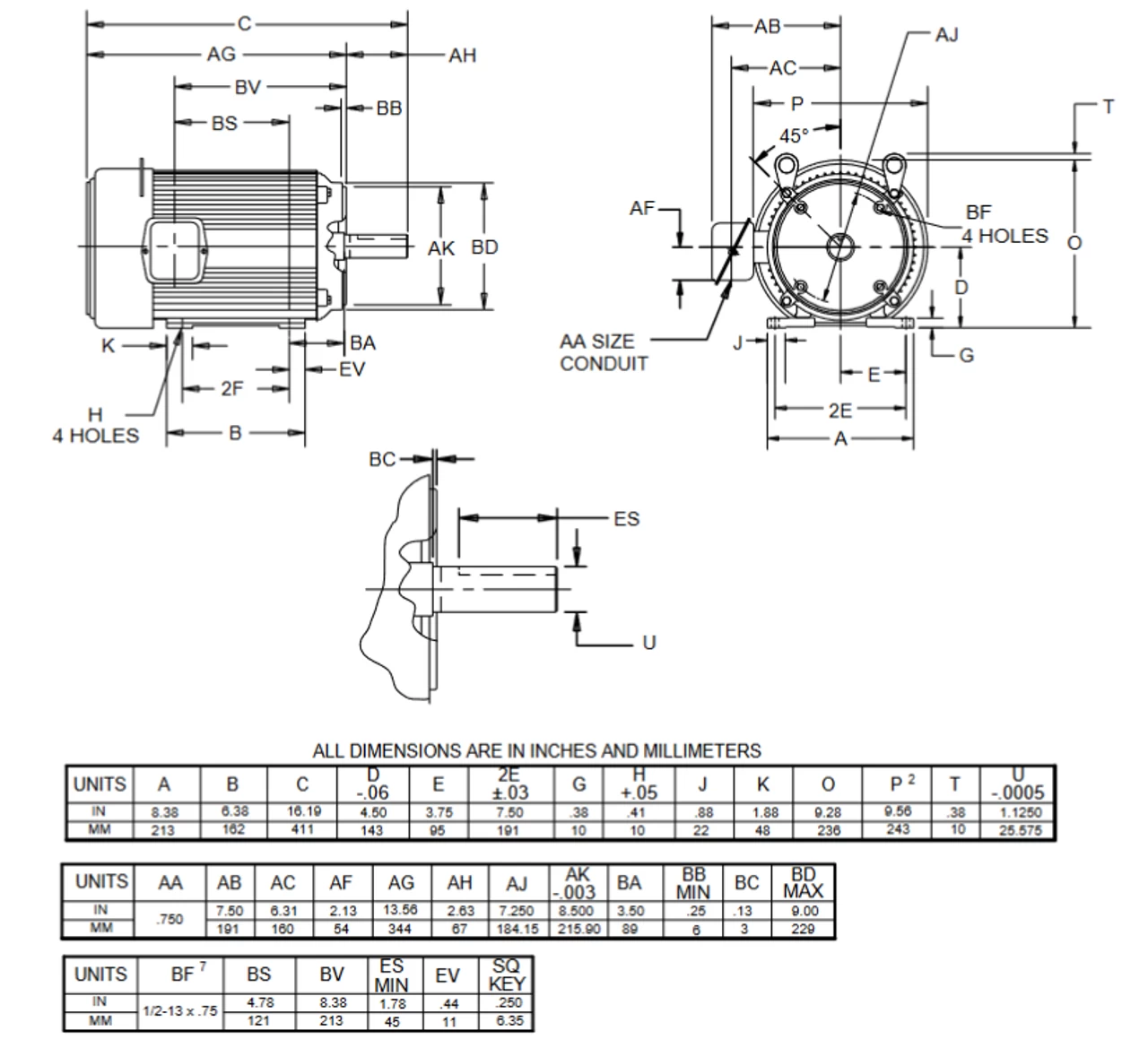 - NEMA 182TC Extruded Aluminum Frame with Cast Aluminum End Bells, Keyed Shaft 1 1/8″ Diameter x 2 3/4″